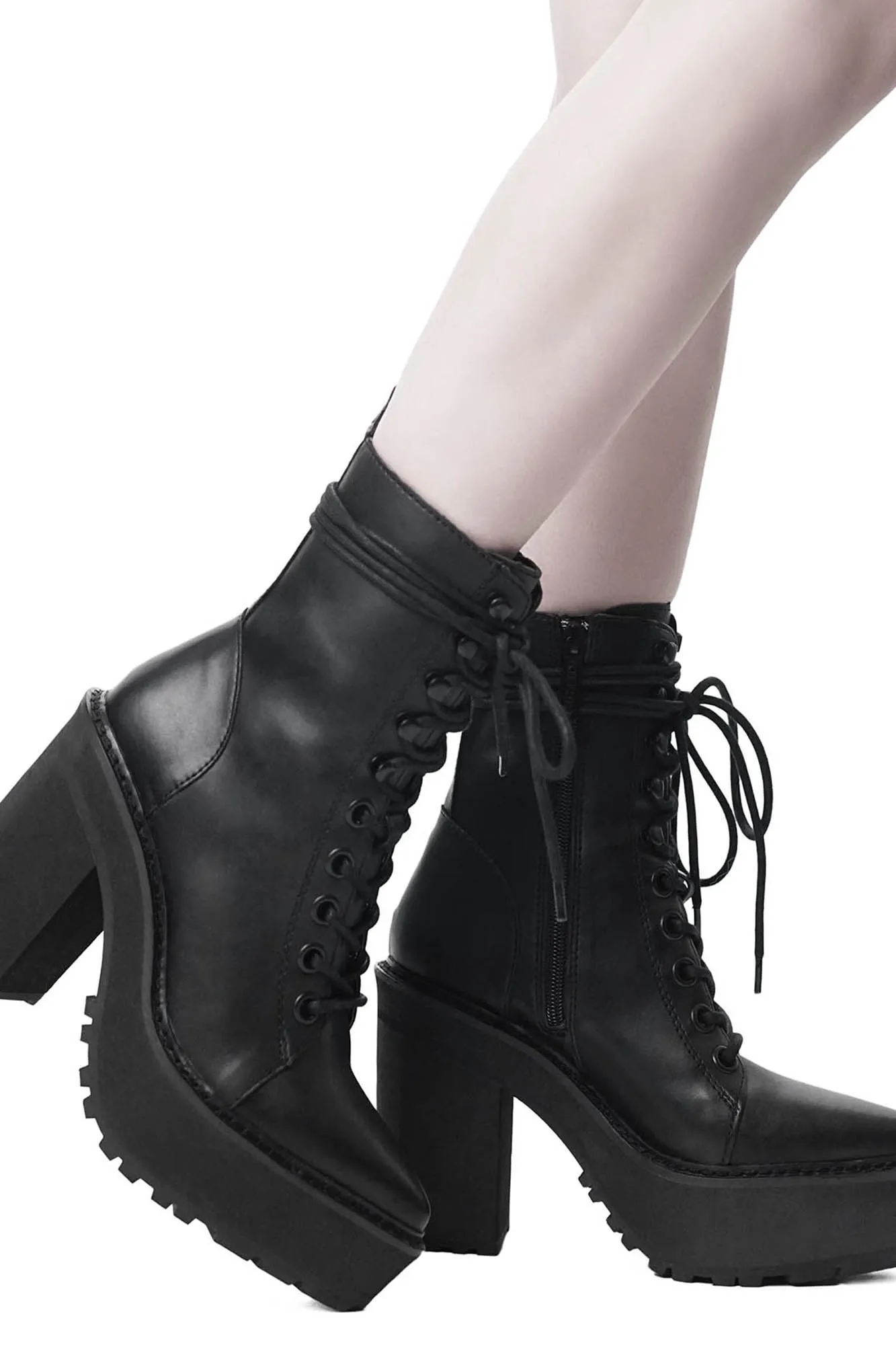 Perfect for the modern witch, the 'Salem City' boots are summoned in the highest quality faux leather, pointed toe, lace-up front with extra long laces and zip side for easy on/off. With a 4" heel, giving you just the right amount of elevation. Ready to rock with yer coven, nights out - or just doing day-to-day stuff out the coffin.
